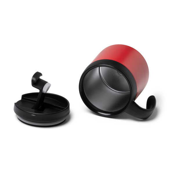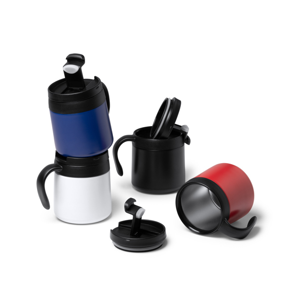 Caneca de parede dupla em aço inoxidável 304 reciclado com tampa de rosca e pega. Capacidade para 350 ml. Apresentação em caixa de design ecológico.