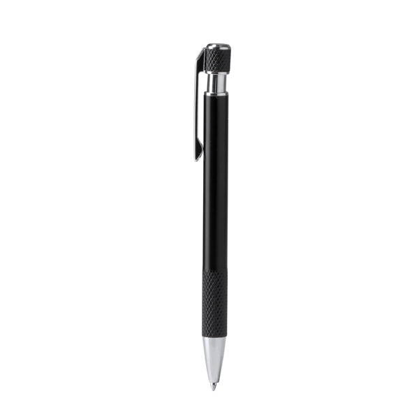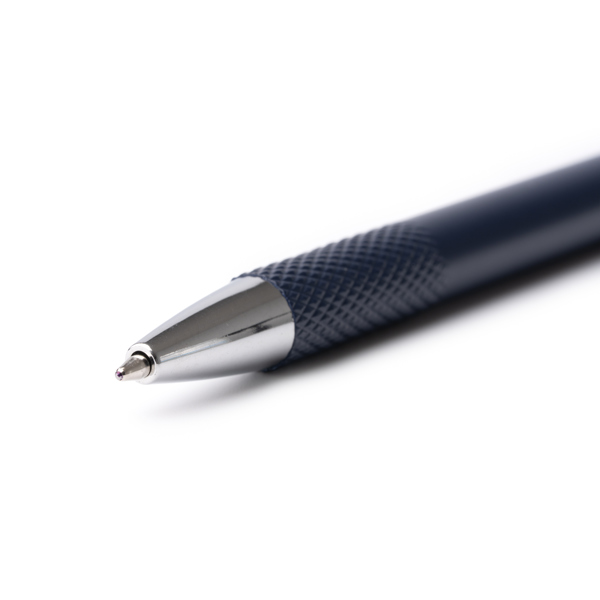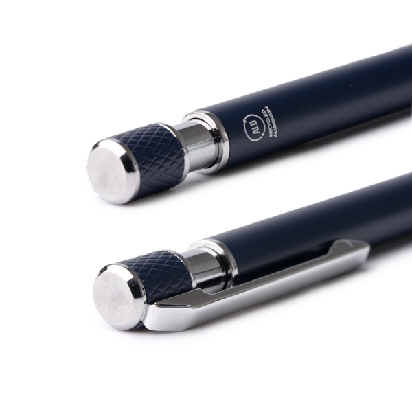 Caneta em alumínio reciclado acabada em cor sólida mate com detalhes prateados. Texturizada na zona de pegada e no botão. Tinta azul.