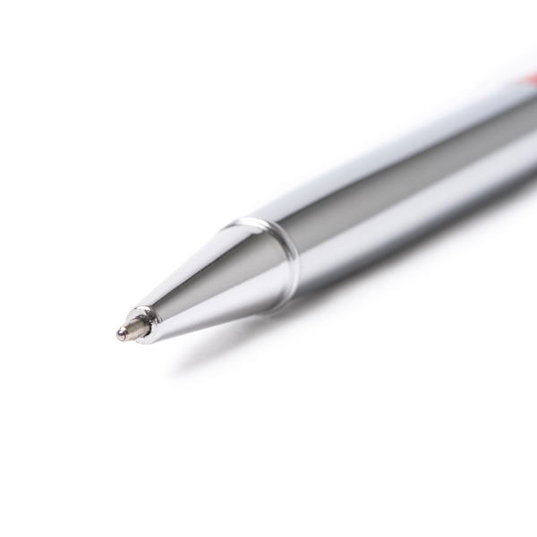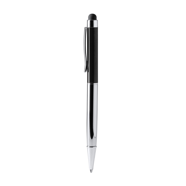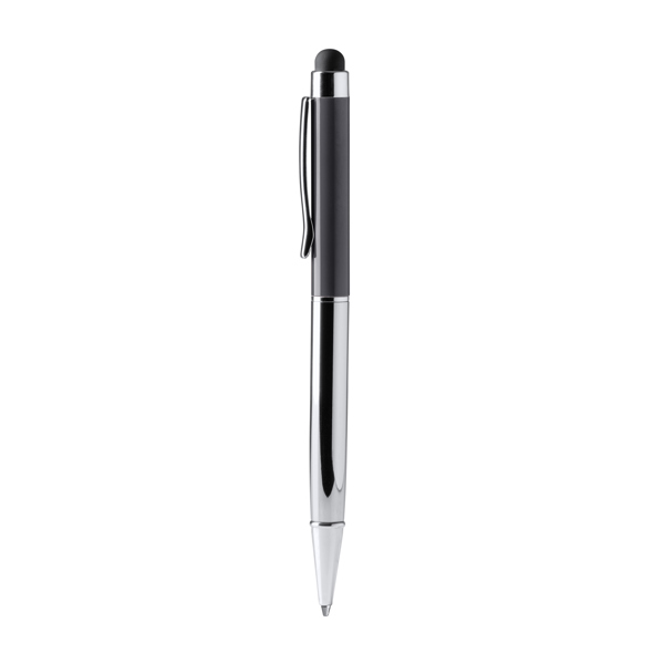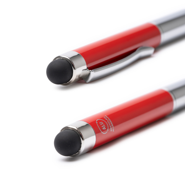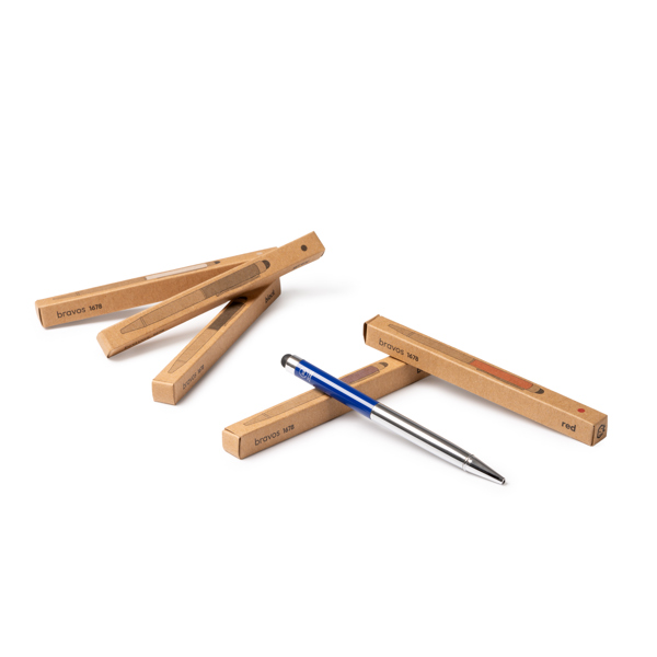 Esferográfica com corpo em alumínio reciclado e ponteiro tátil. Ponta e clipe em metal cromado. Recarga de tinta Jumbo em azul metálico. Apresentação em caixa de design kraft.