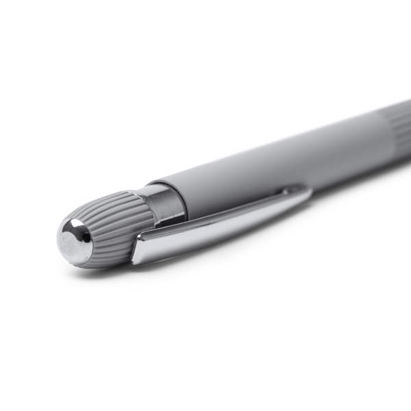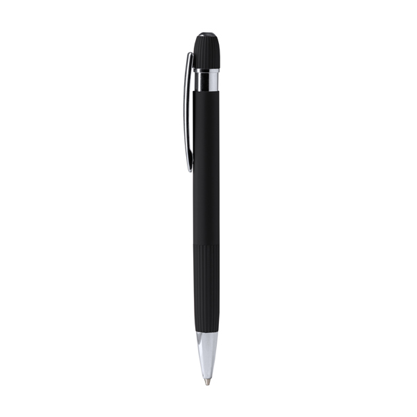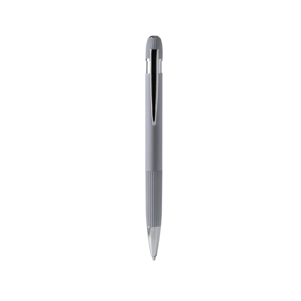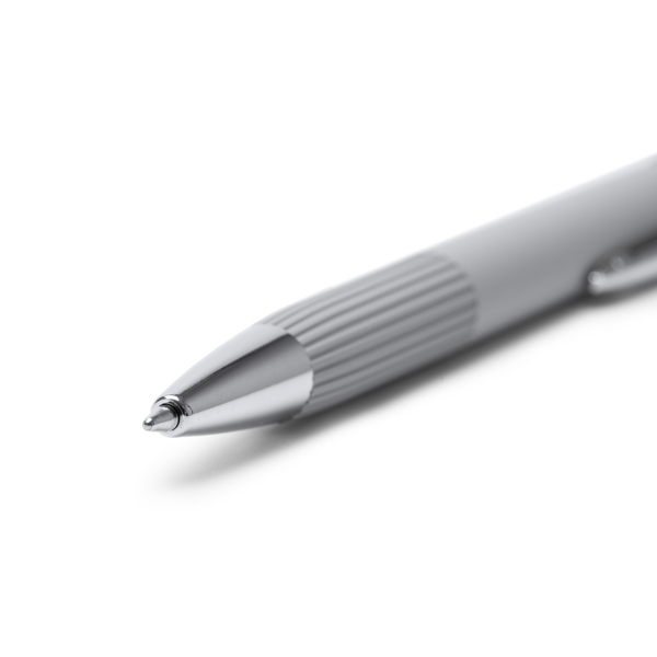 Caneta com corpo em alumínio reciclado com pega às riscas e acabamento tátil em borracha mate. Pormenores em acabamento cromado. Recarga de tinta Jumbo em azul.