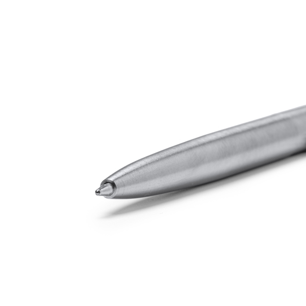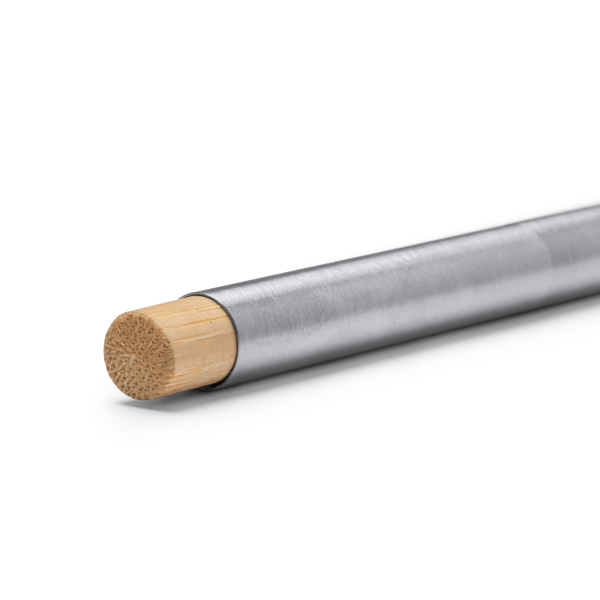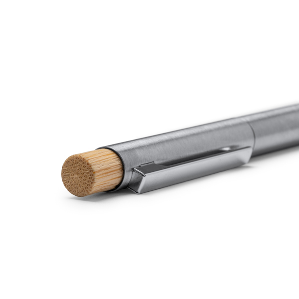 Caneta em aço inoxidável reciclado e botão de pressão em bambu. Tinta de cor azul.