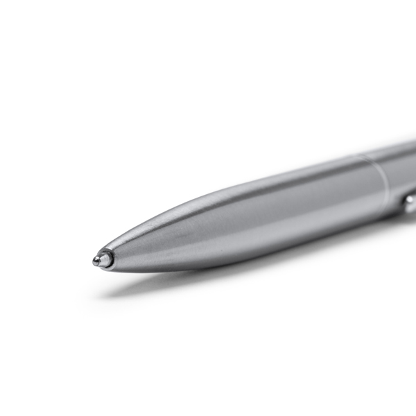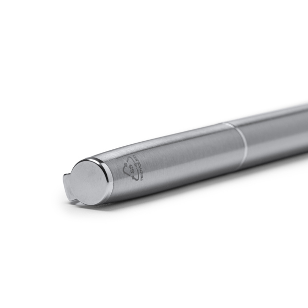 Caneta giratória com cano em aço inoxidável reciclado, com um design robusto e sustentável. Tinta azul em cartucho metálico. Apresentada numa elegante caixa individual em kraft. Ideal para oferta, combina funcionalidade e consciência ambiental.
