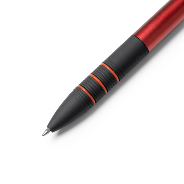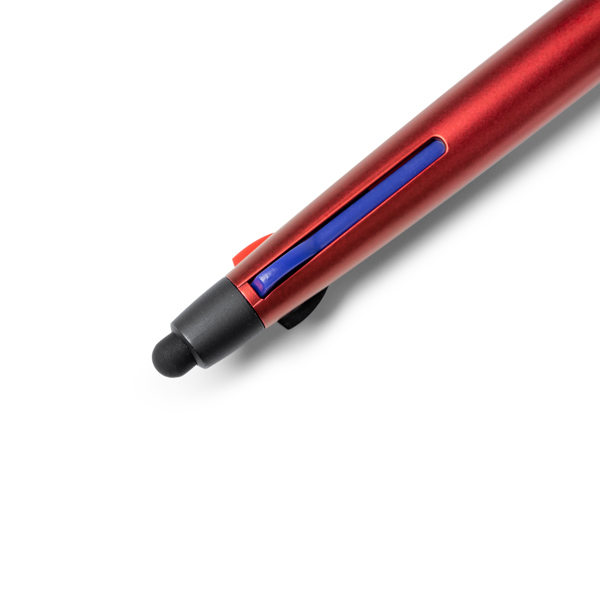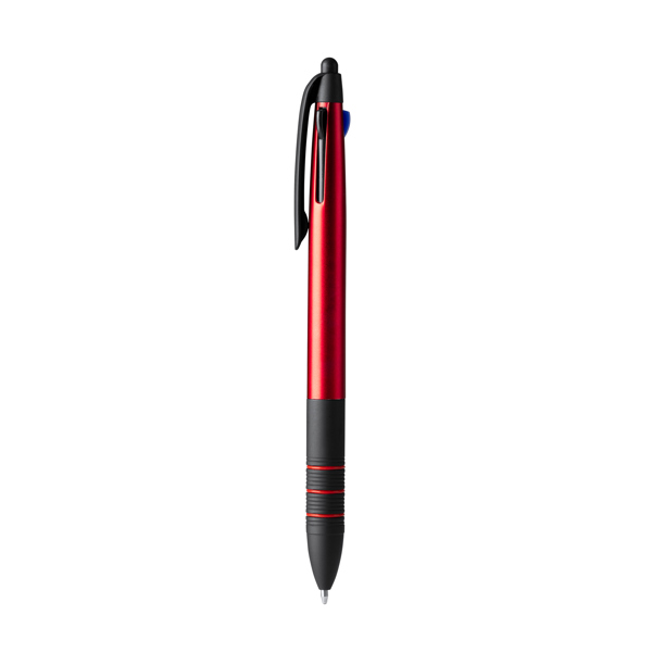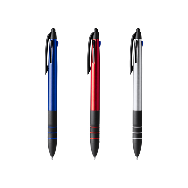 Caneta esferográfica retrátil de três cores. Corpo em ABS com detalhes a preto e revestimento suave. Ponteira táctil. Tintas azul, preta e vermelha.