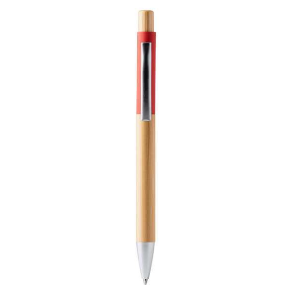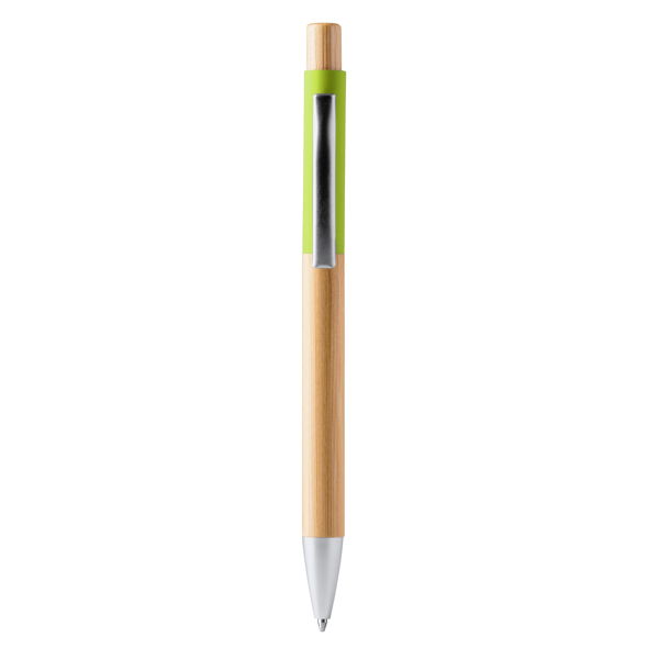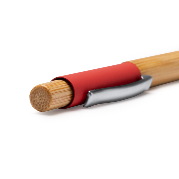 Esferográfica com estrutura e botão de pressão em bambu. Detalhe de cor com toque suave. Ponta e clipe em metal. Tinta azul.