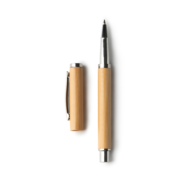 Caneta rotativa com corpo de bambu e detalhes em metal. Grande recarga de tinta azul.