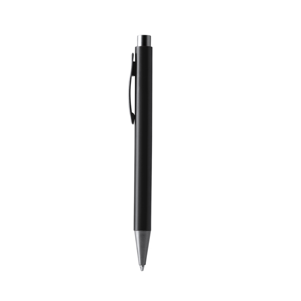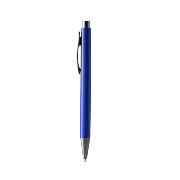Caneta de pressão em ABS com detalhes em acabamento metálico mate. Tinta de cor azul.