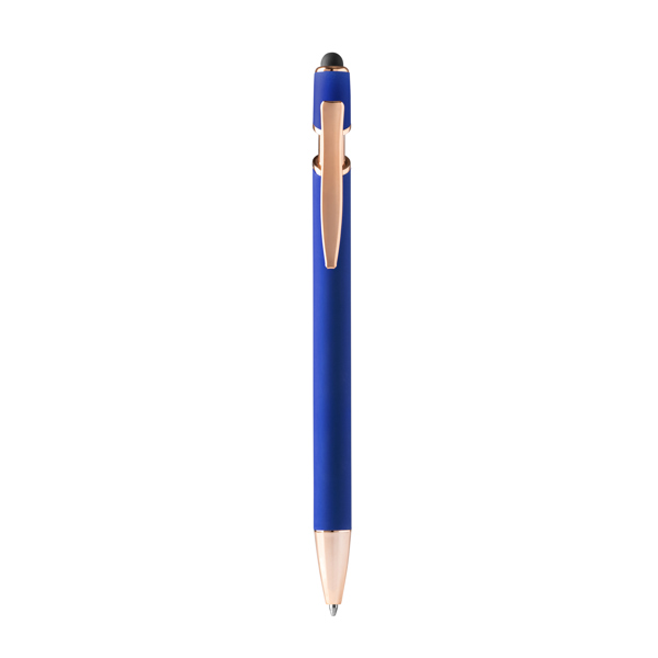 Esferográfica em metal de toque suave com detalhes em ouro rosa. Recarga jumbo de tinta azul. Ideal para impressão a laser.