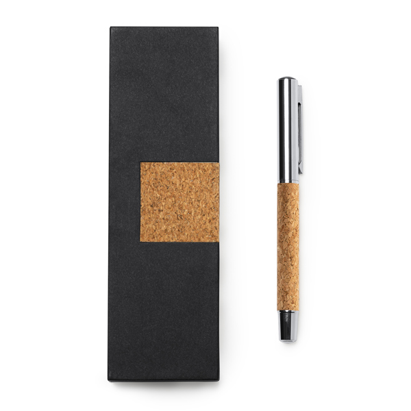 Caneta roller em cortiça natural e aço. Apresentação em estojo elegante com detalhe em cortiça e revestimento interior acolchoado. Tinta azul.