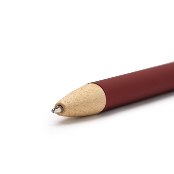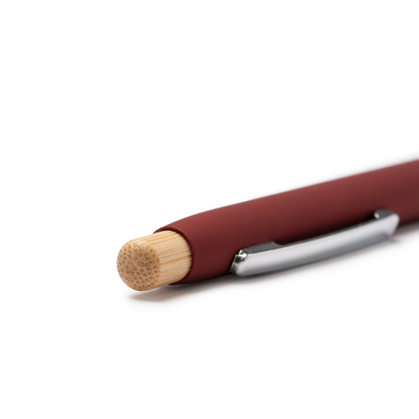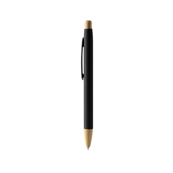 Caneta de metal emborrachado com acabamento de botão de pressão e detalhes em bambu, oferecendo um design natural e sustentável. O clip cromado confere um toque de elegância e funcionalidade. Recarga de tinta azul Jumbo.