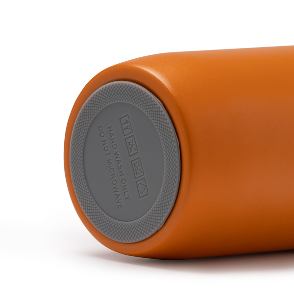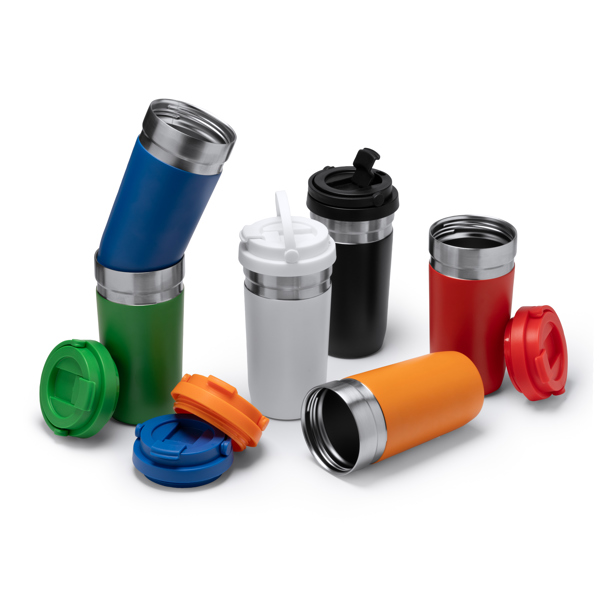 Copo térmico de parede dupla, com pega, em aço inoxidável 304, acabamento mate. tampa com bico de rosca. Base antiderrapante