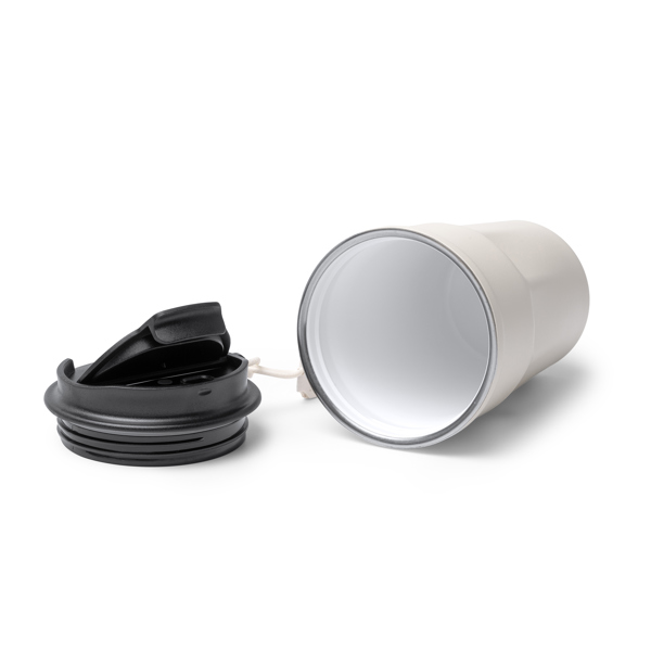 Copo térmico de parede dupla, com pega, revestido a cerâmica, em aço inoxidável 304. Tampa de rosca de segurança e base antiderrapante.