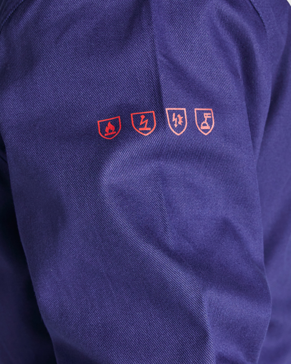 Macacão de trabalho ignífugo de manga comprida raglan em tecido resistente. Fecho de correr frontal bidirecional com aba e fechos de velcro. Cintura e punhos com elástico. Bolso no lado direito do peito com aba e fechos de velcro. Bolsos laterais com aba e fechos de velcro. Símbolos retardadores de chama impressos na manga direita. Ciclos de lavagem: x50