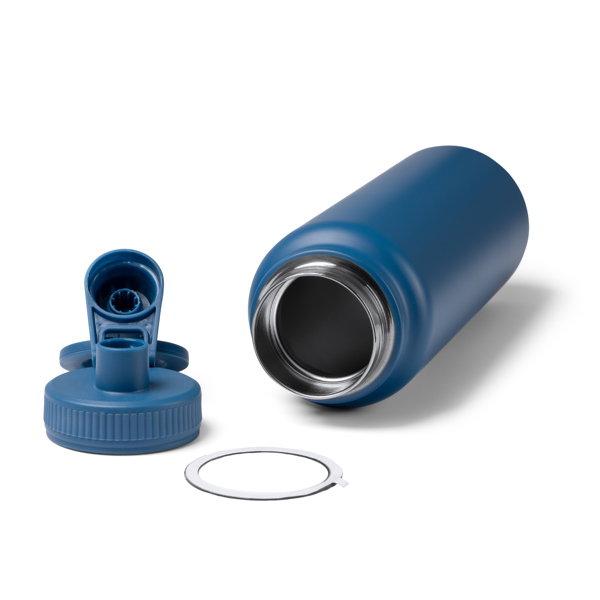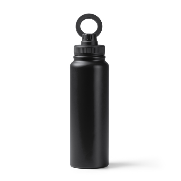Garrafa térmica de parede dupla em aço inoxidável 304 reciclado com tampa com anel magnético para suporte de telemóvel. Borracha antiderrapante na base. Capacidade: 1 L. Apresentação em caixa de design ecológico.
