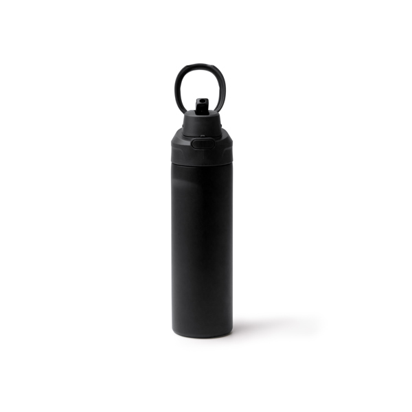 Garrafa térmica de parede dupla fabricada em aço inoxidável 304 reciclado. Capacidade: 700 ml. Com pega de transporte e palhinha extensível adicional. Tampa principal com abertura por botão.
