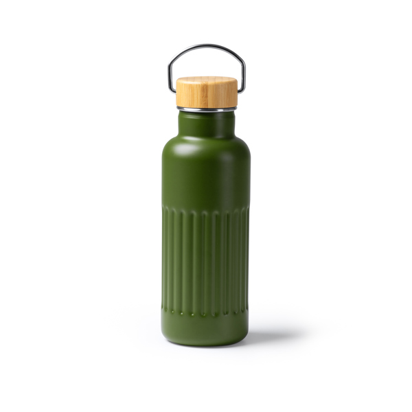 Garrafa térmica em aço inoxidável 304 reciclado com design de parede dupla biselada e tampa em bambu. Capacidade: 500 ml. Apresentação em caixa de design ecológico.