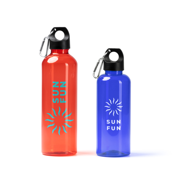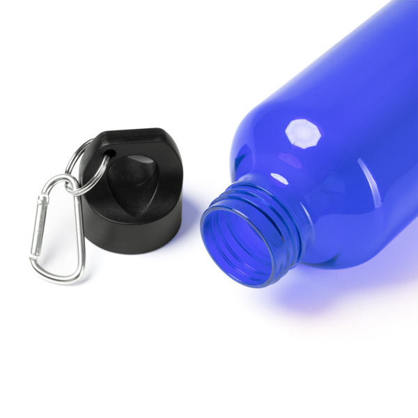 Garrafa com corpo em RPET. Tampa e pega de transporte com mosquetão. Capacidade: 580 ml.