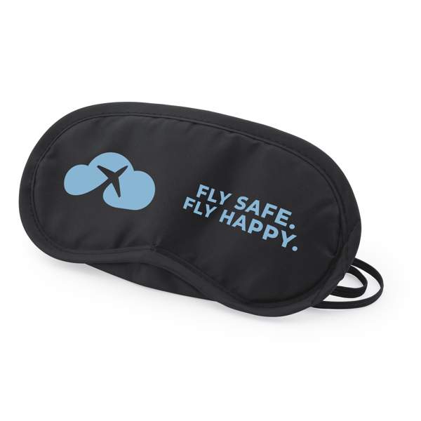 Máscara de viagem feita em microfibra macia. Ajuste elástico duplo.