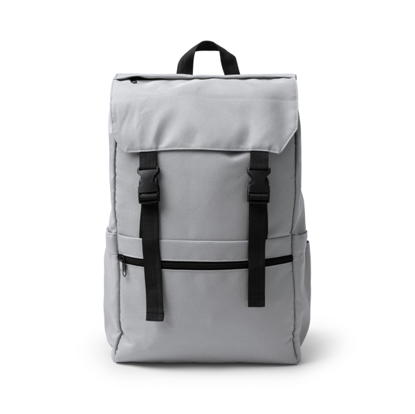 Mochila com aba em RPET 600D. Aba com fechos ajustáveis. Compartimento principal com bolso interior para computador portátil de 15”. Bolso exterior na aba e bolso frontal com fecho de correr e 2 bolsos laterais com elástico. Pegas e costas almofadadas.