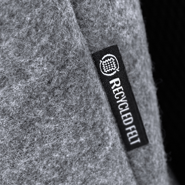 Mochila em feltro reciclado com aba. Inclui mosquetão para fechar o compartimento principal, bolso frontal para guardar pequenos pertences e pegas ajustáveis.