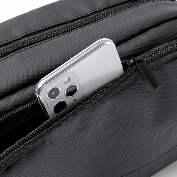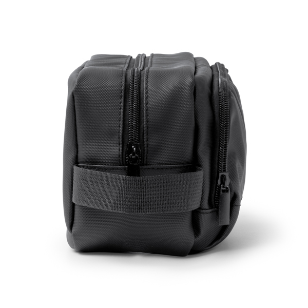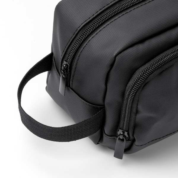 Necessaire em pele PU com compartimento duplo e fecho de correr, ideal para organizar os artigos de higiene pessoal de forma segura e elegante. Inclui pega de transporte.