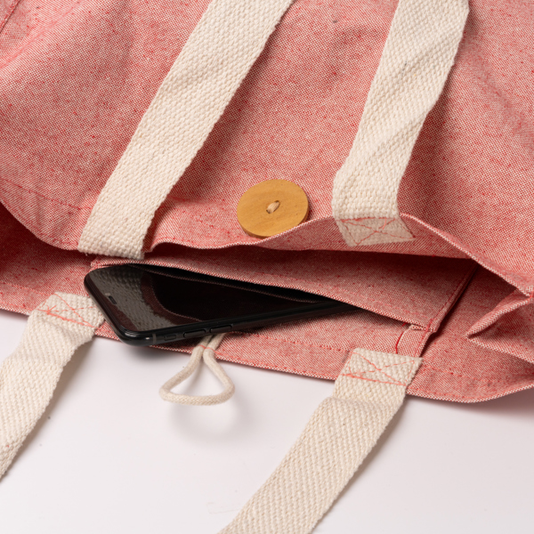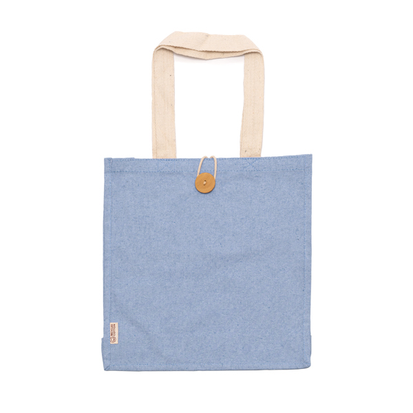 Saco de algodão reciclado 300g/m² com acabamento em urze. Alças reforçadas de 70 cm de comprimento. Aperta com botões.
