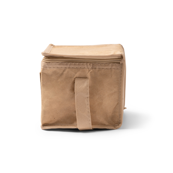 Saco em papel laminado de desenho clássico, interior isotérmico de alumínio e lapela com fecho de correr. Incluí asa prática para transporte.