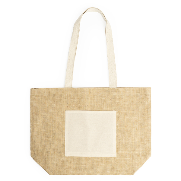Saco de juta laminada com bolso frontal e alças compridas em algodão natural.