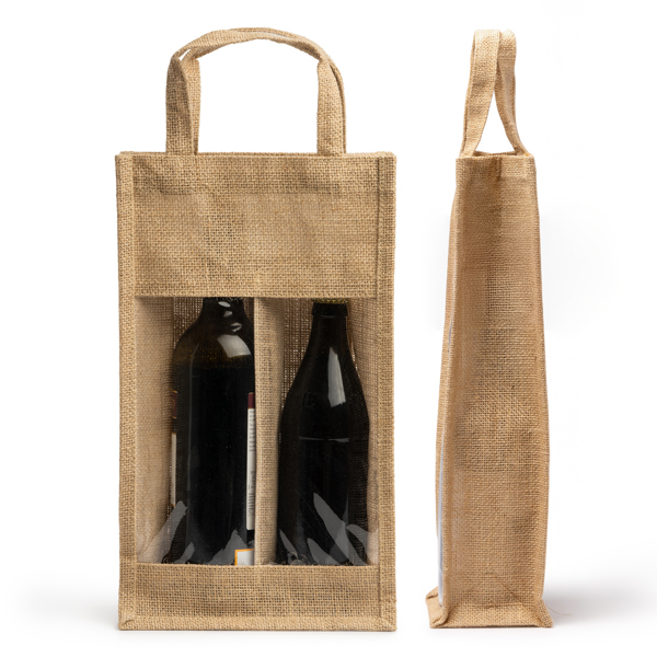 Saco de juta laminada com visor e compartimento duplo. Ideal para garrafas. Alças reforçadas.