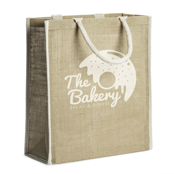 Saco de juta natural com tubagem de algodão e alças reforçadas. Acabamento costurado