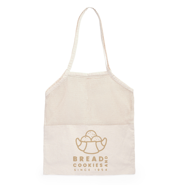 Saco de fruta linha eco 100% algodão 180 g/m². Cor natural. Alças de 60 cm. Metade do saco em material macio e metade em malha.