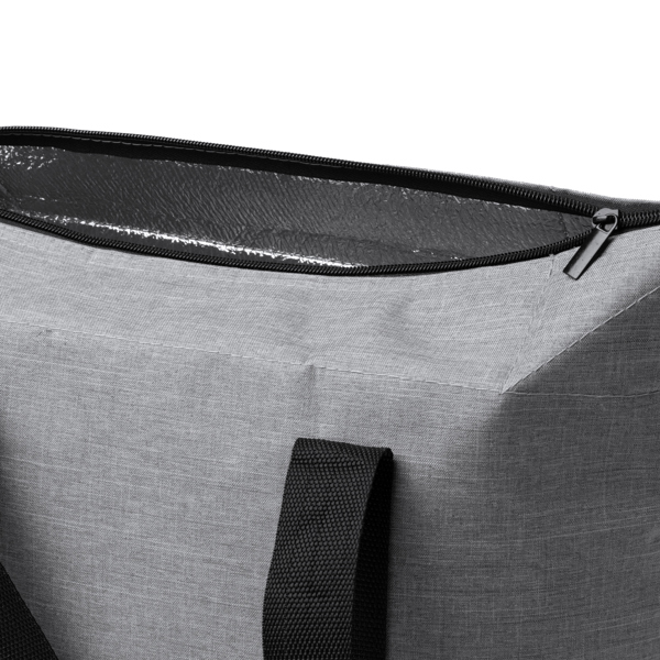 Saco térmico expansível em poliéster RPET, fácil de dobrar. Compartimento principal espaçoso com forro isotérmico.